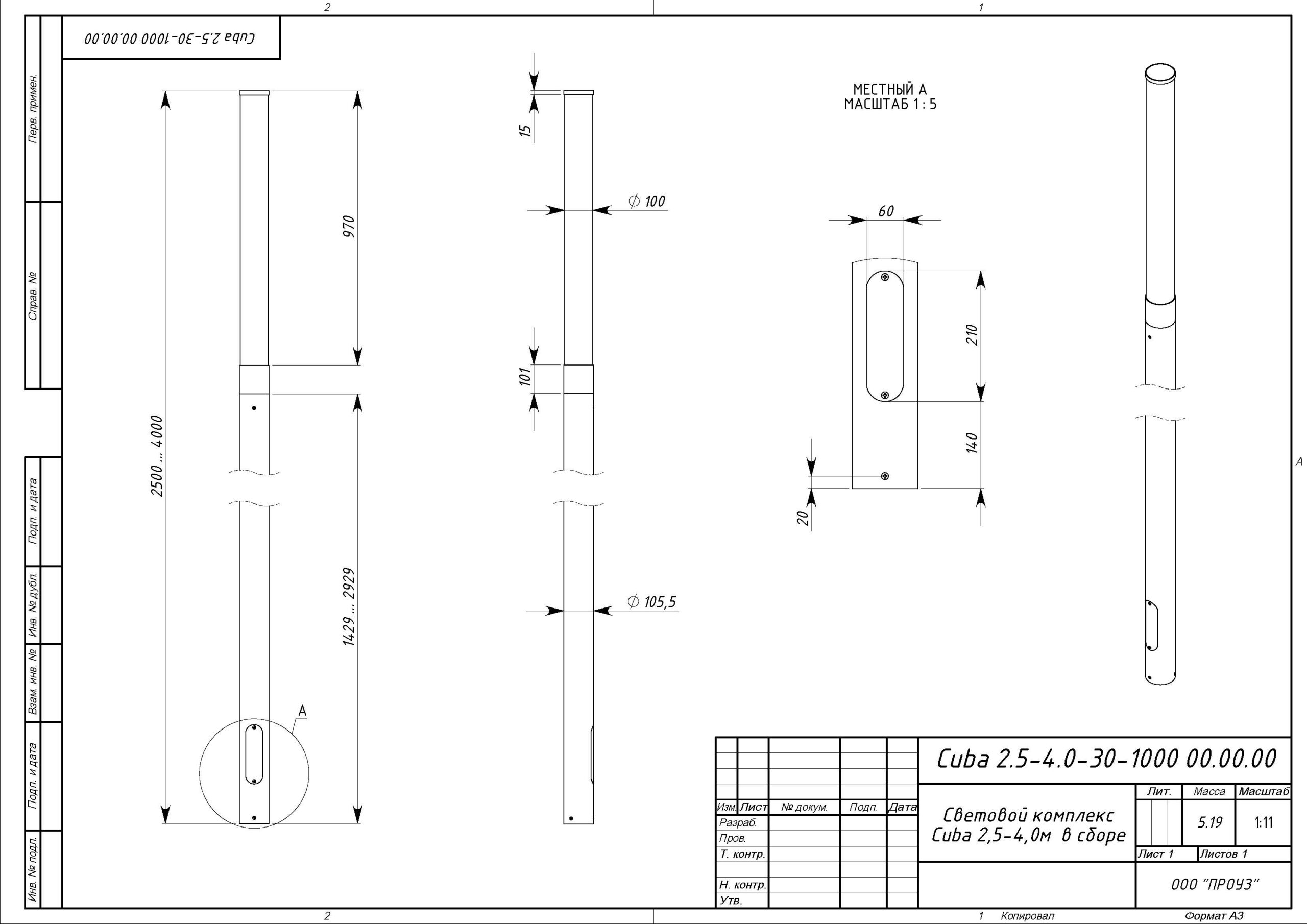 Высота светового комплекса может варьироваться от 0,8 до 6 метров. В опоре предусмотрен монтажно-ревизионный люк. Дополнительно опора может комплектоваться декоративными фланцевыми крышками, метизами, закладными деталями, электромонтажной панелью.