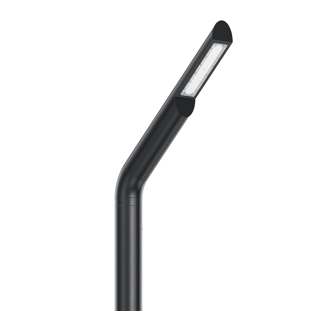 Фирменный признак — плавные скругления в верхней части перехода от опоры к светильнику, что создает запоминающийся современный облик.