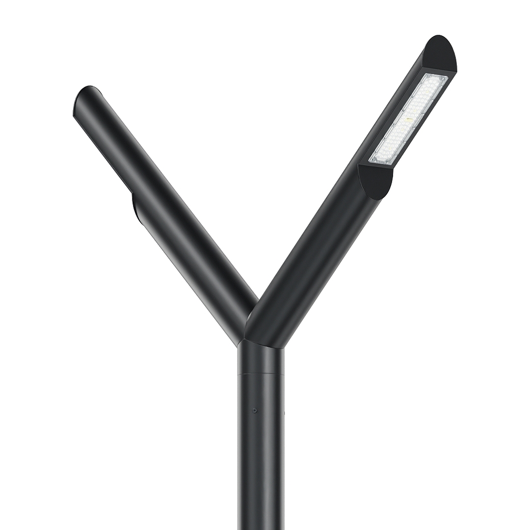 Фирменный признак — плавные скругления в верхней части перехода от опоры к светильнику, что создает запоминающийся современный облик.