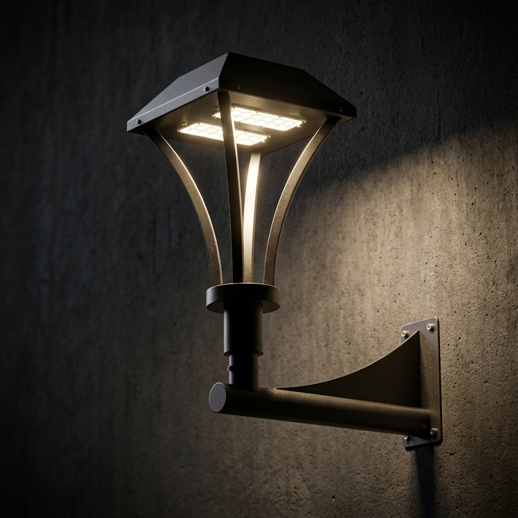Элегантный настенный светильник для фасада, входа или террасы. Сочетает классические формы с современным минимализмом. Даёт мягкий тёплый свет, который красиво подсвечивает стену и создаёт уютную атмосферу.